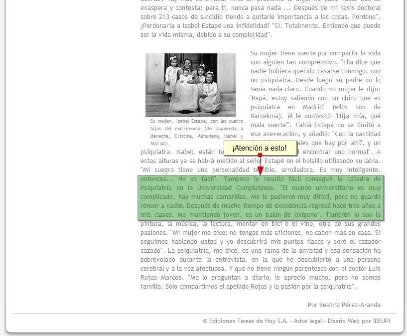 Concretamente, a este impostor «catedrático de Psiquiatría de la Universidad Complutense de Madrid» desde 1984 llamado Enrique Rojas, al que ningún juzgado ha investigado y a mí que no soy aristócrata, sino ciudadana de a pie sin relevancia alguna, me ha costado más de 13 años sentarlo en un banquillo de lo penal, para conseguir que se le juzgue y se le está juzgando sólo por una nimiedad de lo que hizo, sin contemplar que lleva ya 27 años llenando su consulta de personas en situación de «carne de cañón» que pagan su caché porque piensan están en manos «del catedrático de la UCM y su equipo», cuando están en manos de un estafador y un equipo de encubridores, que además se dedica a denigrar a la ciencia todo lo posible, http://www.opuslibros.org/nuevaweb/modules.php?name=News&file=article&sid=5427