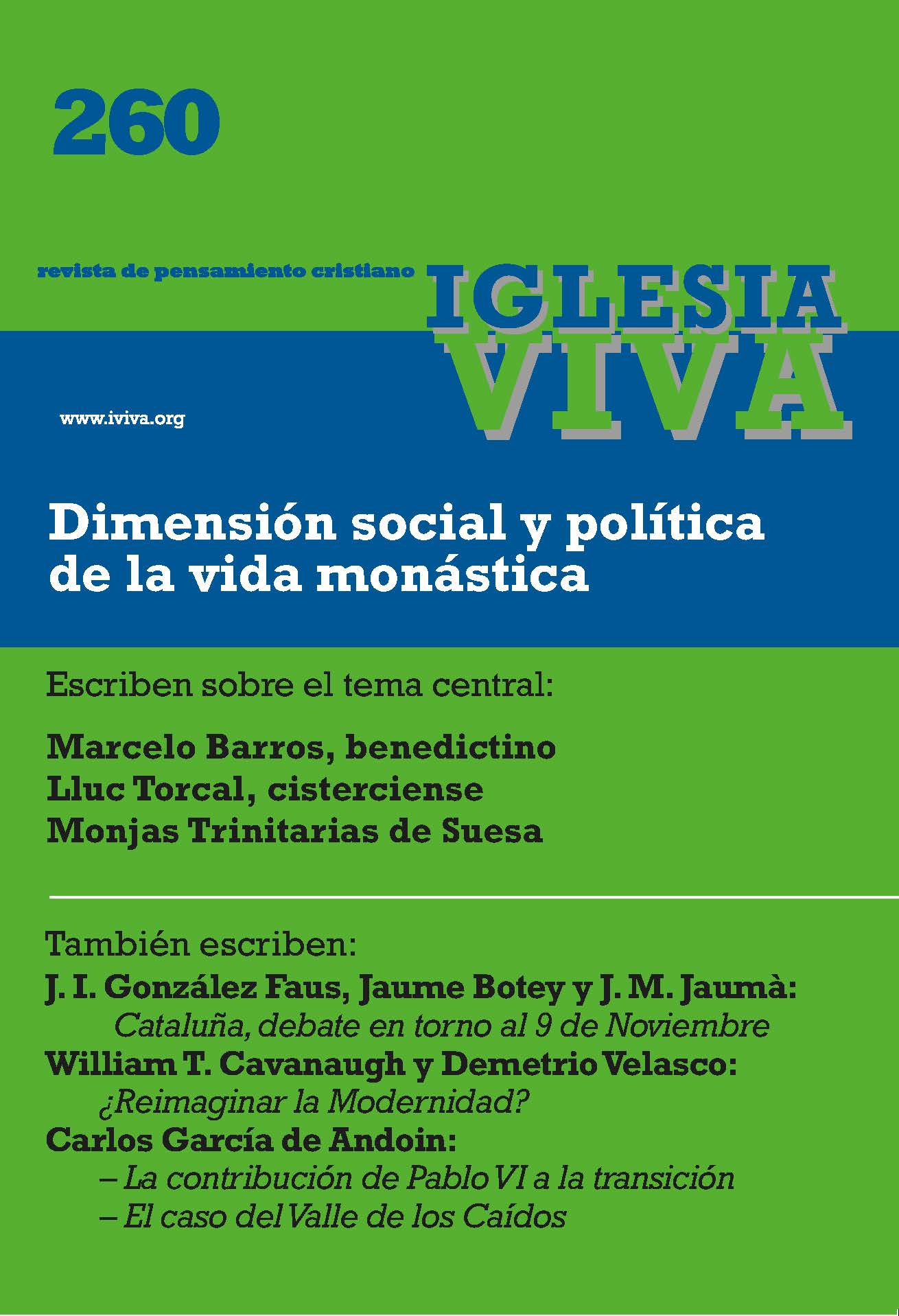 Con ocasión de la presentación del número 260, Dimensión social y política de la vida monástica, Iglesia Viva abre una nueva webque responde mejor a las necesidades de los tiempos venideros. Sin interrumpir la edición trimestral de la revista en papel, inaugura una nueva web donde está todo lo que la revista ha sido -su historia, los miembros que han formado parte del Consejo de Dirección- y lo más importante: ofrece a todos la colección completa de la revista, los 260 números con todos sus artículos escaneados y con varios instrumentos de búsqueda. El público interesado podrá descargar gratis los números hasta 2012. Los números de 2012 hasta el presente presentan un acceso limitado a suscriptores.
