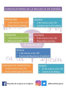 Antes de leer nada, os digo que a las ciudades mencionadas hay que añadir Granada el día 15 de Marzo, con el mismo lema: «hasta que la igualdad se haga costumbre», con manifestación en la puerta de la catedral, manifiesto, pancartas, rueda de prensa, etc. Aún estamos concretando alguna cosita.