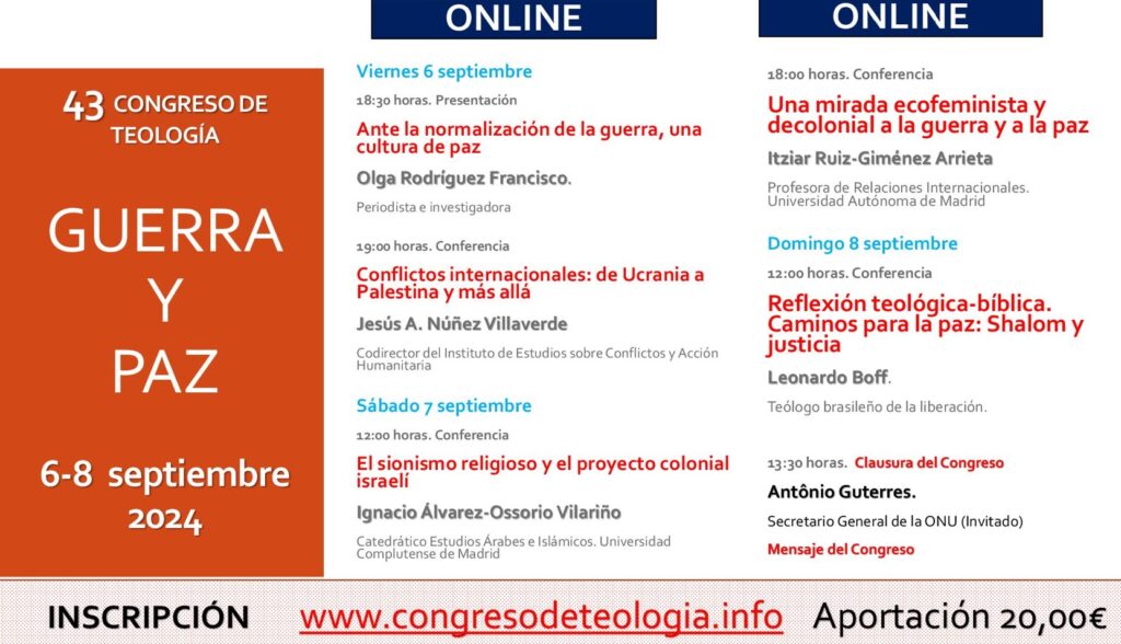 Del 6 al 8 de septiembre de 2024 celebraremos el 43 Congreso de Teología, como venimos haciendo ininterrumpidamente desde 1981. Lo haremos on line para posibilitar la participación de las personas de fuera de España, preferentemente de América Latina, y de quienes que no pueden desplazarse. La paz y la justicia están ausentes en nuestro mundo. En cambio, las guerras están presentes por doquier. Por eso el tema elegido este año es Guerra y paz: ¿hay salida a la vista? Lo consideramos deespecial importancia en este momento histórico marcado por los numerosos conflictos internacionales, que están socavando la paz a nivel mundial, territorial, regional y local, masacrando a poblaciones enteras hasta el genocidio, normalizando la guerra hasta el punto de considerarla un fenómeno con el que hay que convivir y ampliando las brechas de las desigualdades.